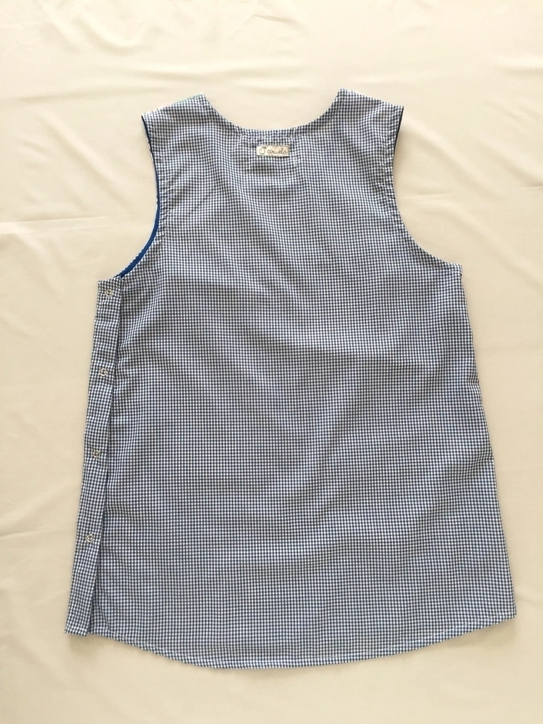 Guardapolvo elaborado de manera artesanal en tela arciel cuadrillé azul calidad INTA con canesú en arciel estampado, broches doble aro metálicos en un lateral y detalles en cinta bies 100% algodón.